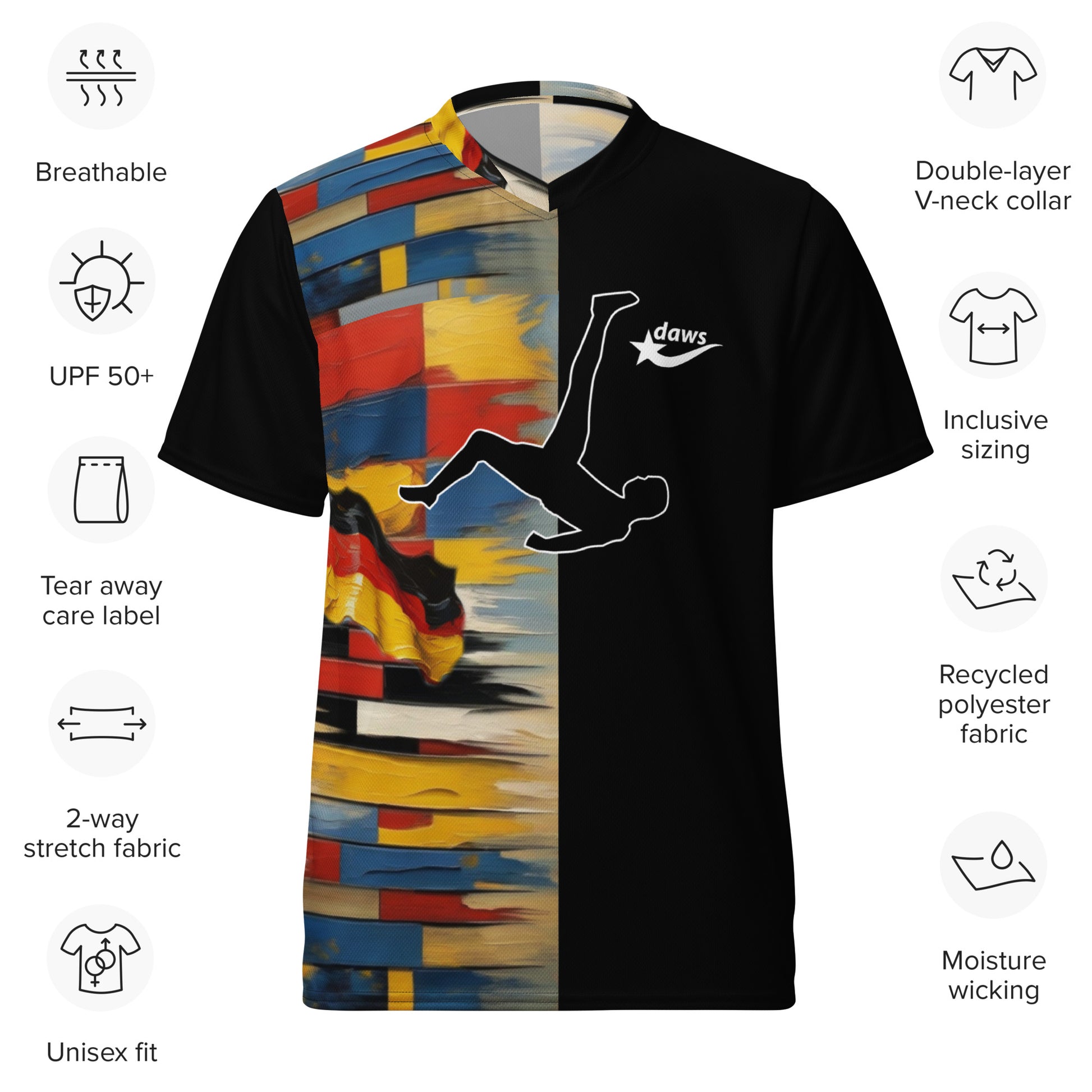 Looking for the perfect sports jersey? We have you covered—made of 100% recycled polyester fabric, this shirt is breathable, moisture-wicking, and has a double-layered v-neck collar that creates a premium look.